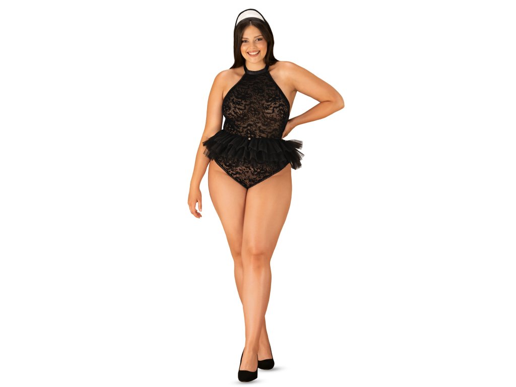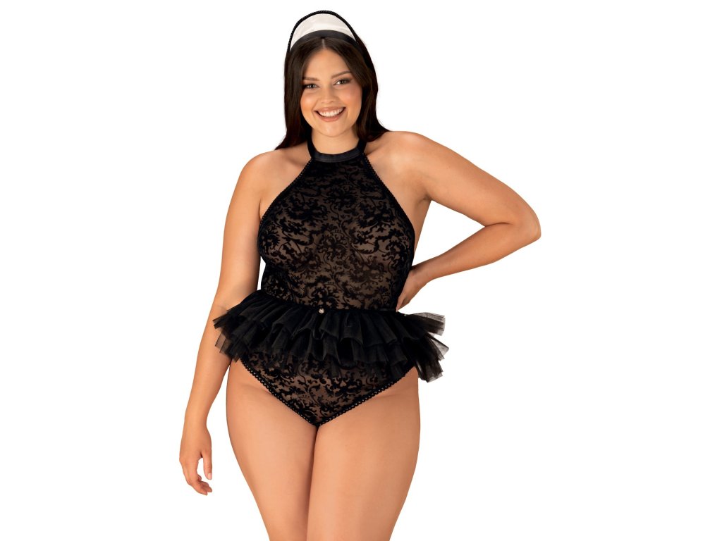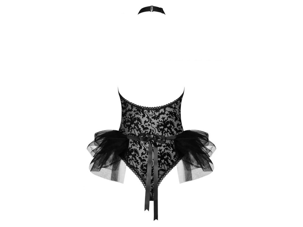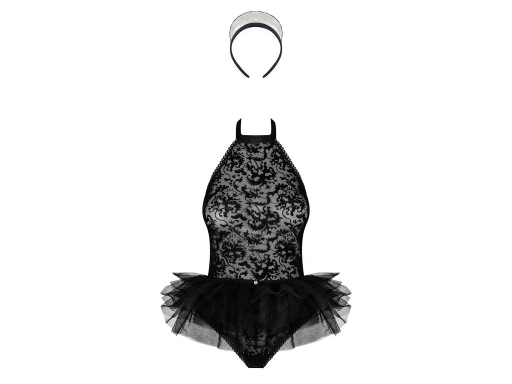 Sexy body se sukní a čelenkou pro služku. Černobílá čelenka - podmanivě okouzlující doplněk. Jemná ramínka nošená kolem krku. Průhledná krajka zvýrazňuje poprsí. Tylová sukně se saténovým vázáním na zádech. Živůtek zapínaný v rozkroku. Zlatý přívěsek na bříšku - upoutá pozornost.