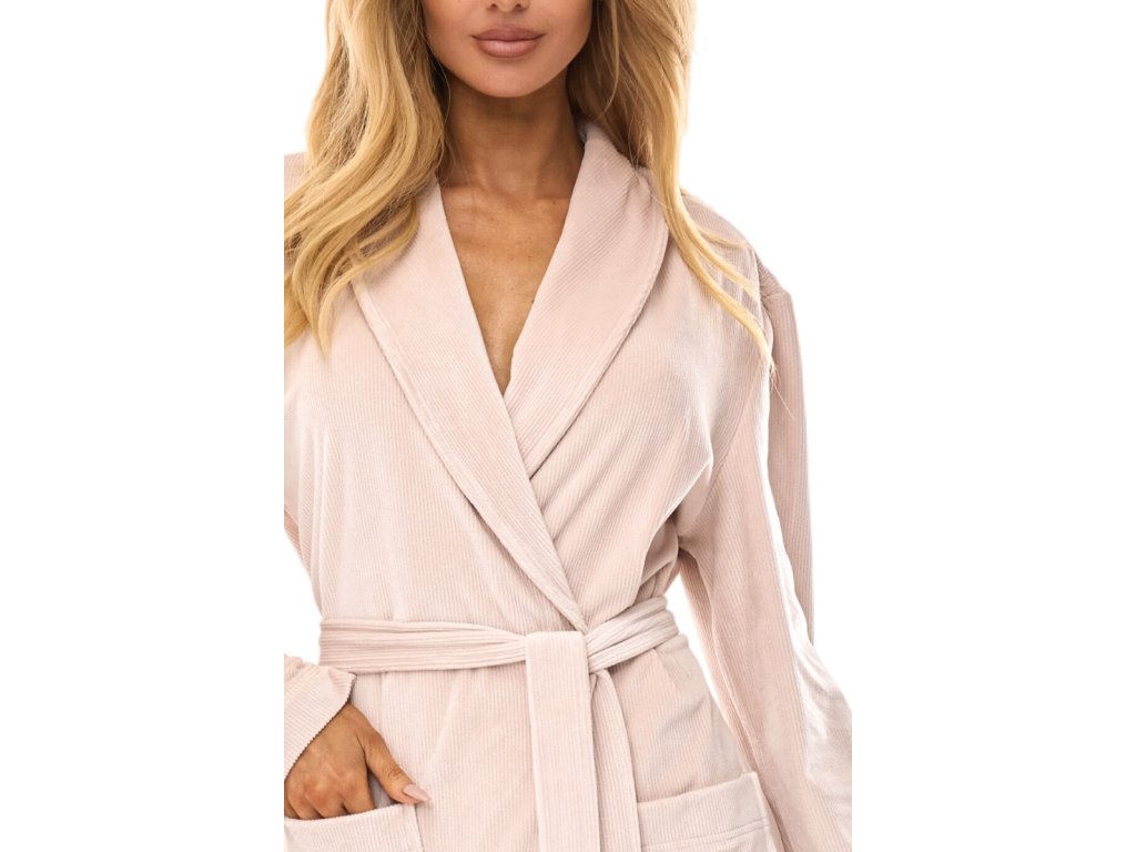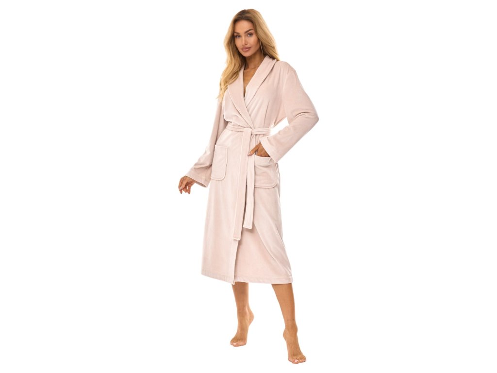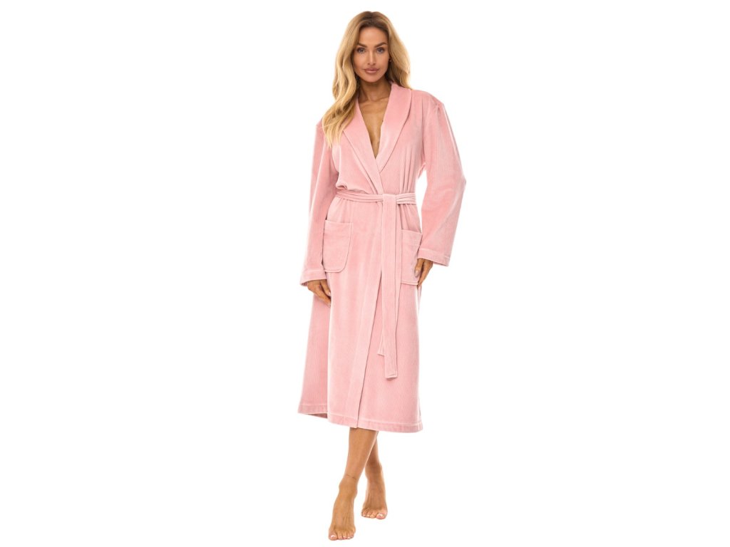 Dámský dlouhý župan s jemně žebrovanou texturou podobnou manšestru, šálovým límcem, dlouhými rukávy, zavazováním v pase a kapsami.