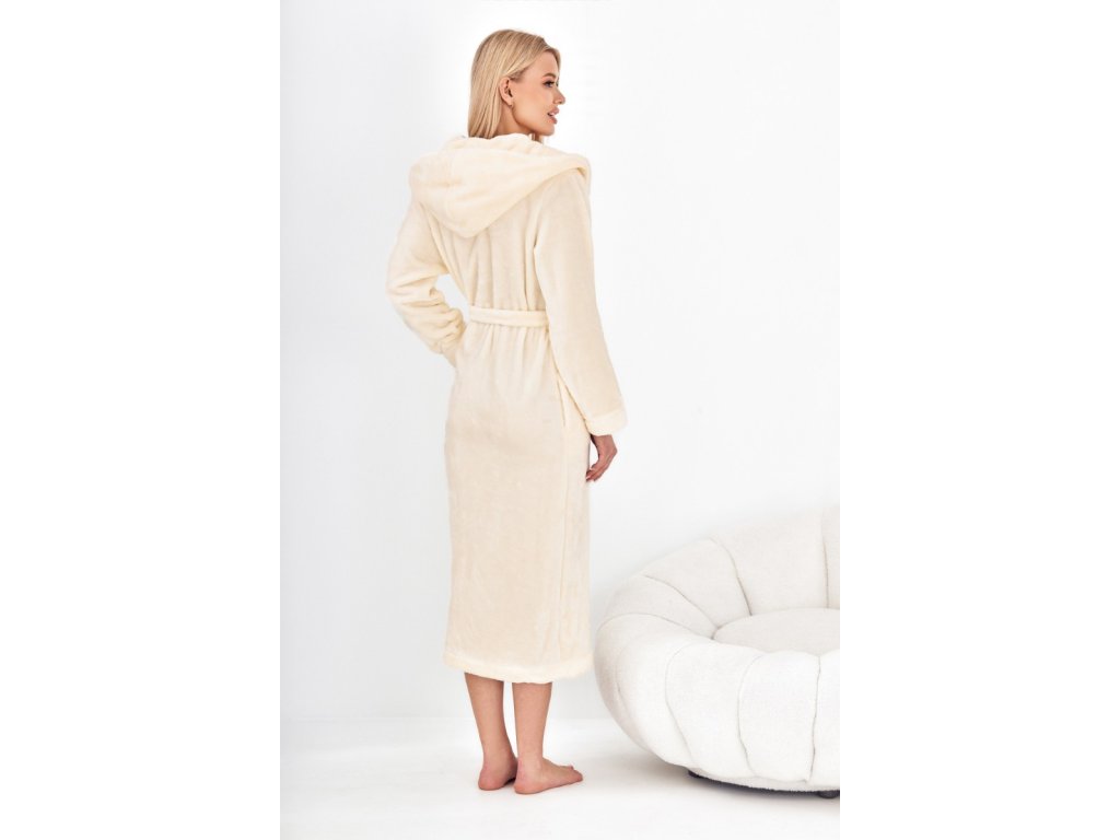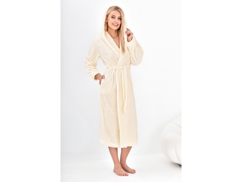 Dámský dlouhý župan s kapucí. Měkký úplet, dlouhé rukávy, zavazování v pase a pohodlné kapsy.