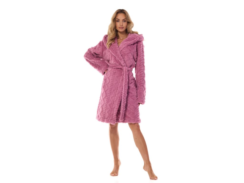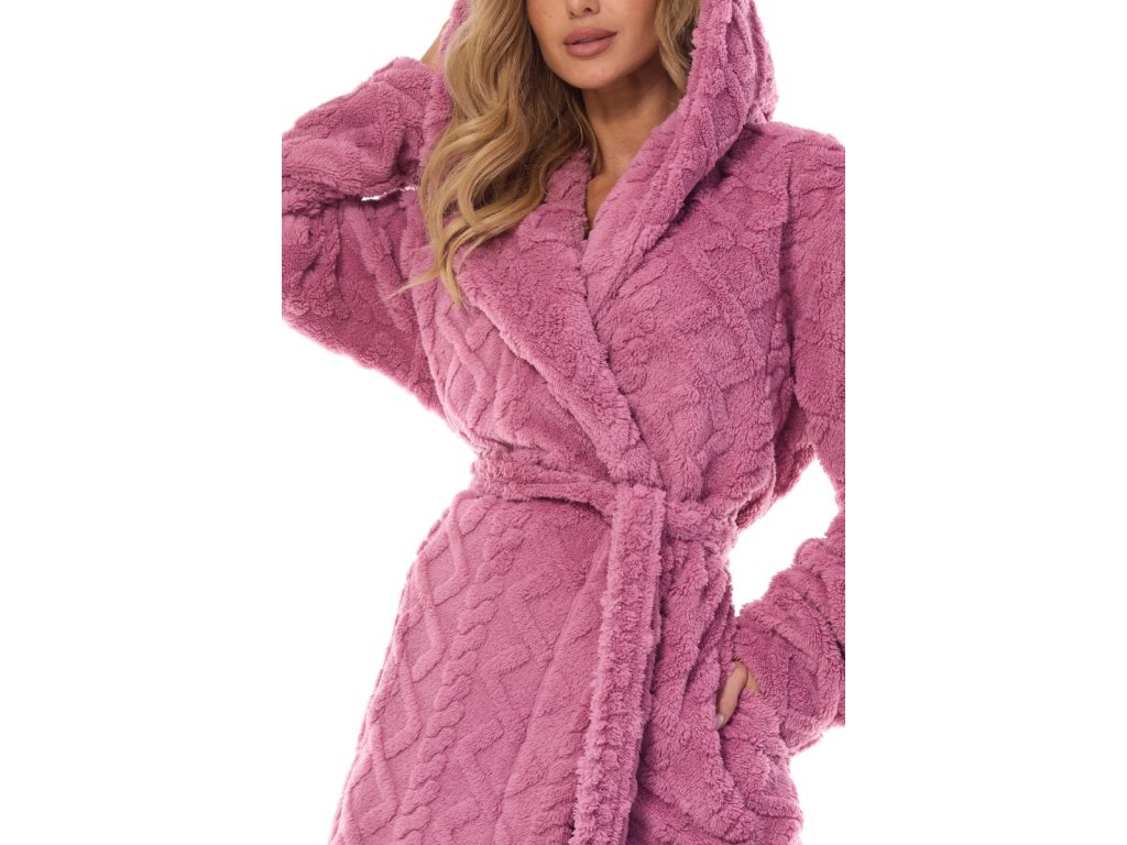 Dámský krátký župan s kapucí. Měkký úplet s reliéfním, vyvýšeným vzorem. Dlouhé rukávy. Zavazování v pase. Dvě vnější kapsy.