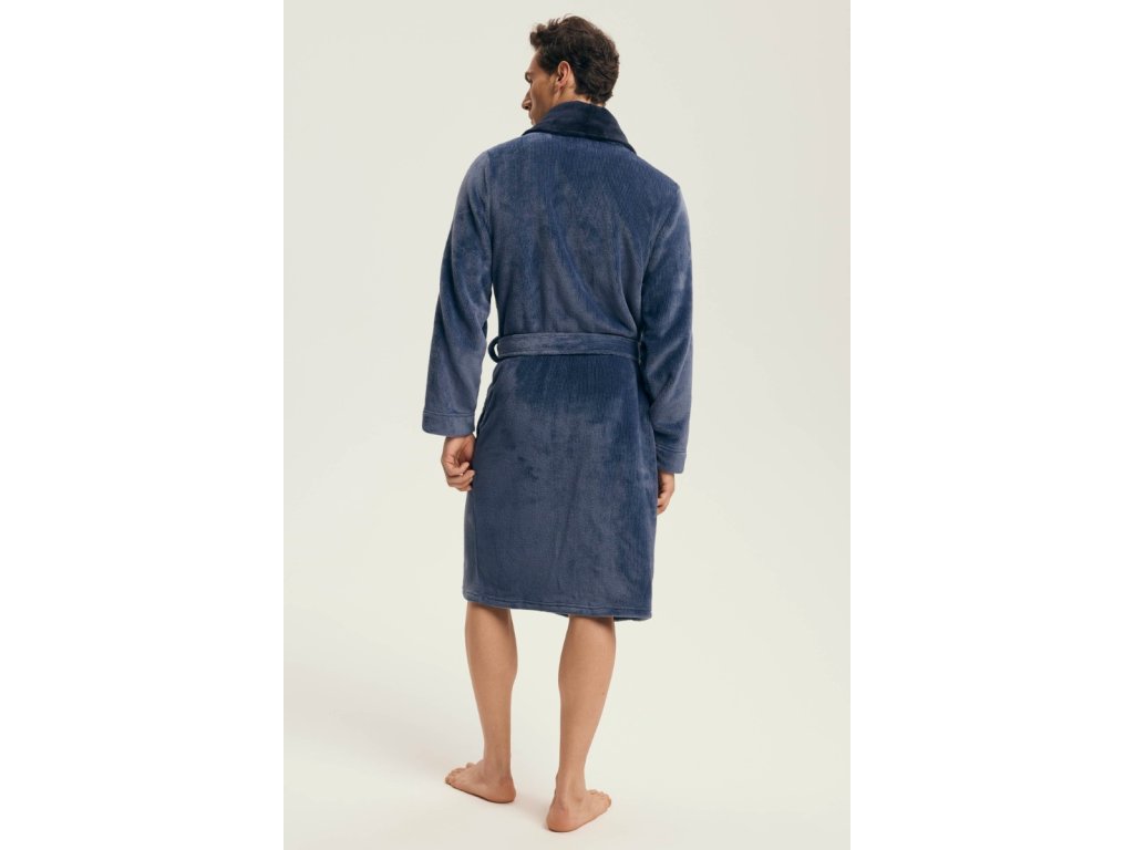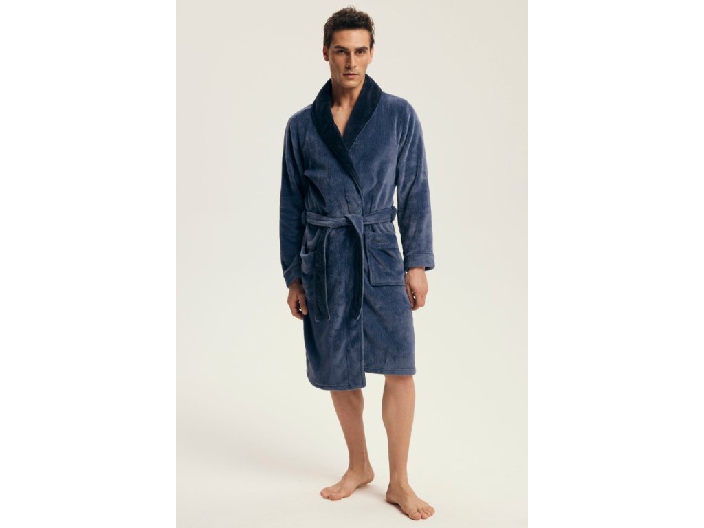 Klasický pánský župan se šálovým límcem, z měkkého, pohodlného úpletu, zavazováním v pase, dvěma vnějšími kapsami a délkou po kolena.